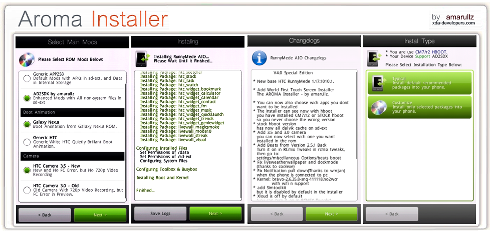 – Supports generic A2SD and custom AD2SDX by amarullz (only for CM7r2 HBOOT): requires 1 to 1.5GB ext4!