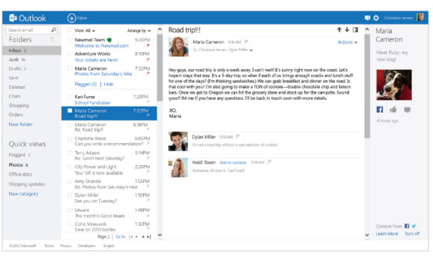 Outlook.com’un arayüzü, Windows 8’den etkileniyor ve ondan birçok öğe alıyor. Bunun yanında Facebook, Twitter ve Skype ile bütünleşik olan hizmet, SkyDrive ile derinden bağlı.
